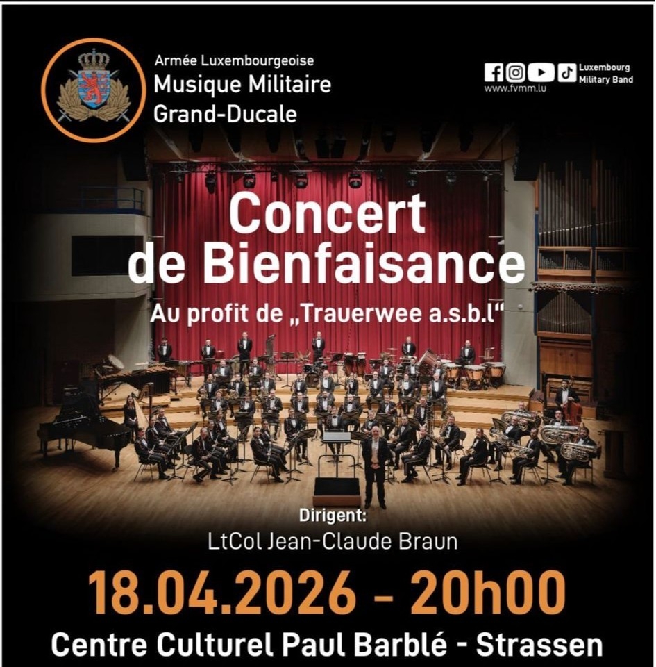 Nous avons le plaisir de vous inviter dans le cadre du Pot du Printemps du Rotary à un concert de bienfaisance de la Musique Militaire Grand-Ducale qui aura lieu le Samedi 18 avril 2026 à 20 heures au Centre Barblé à Strassen.